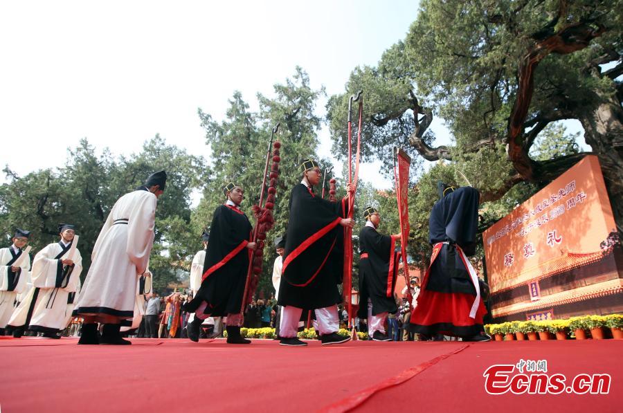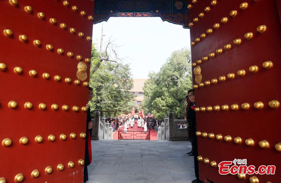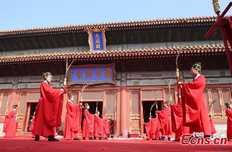 Participants wearing traditional costumes perform during a ritual to mark the 2,569th birthday of Confucius atthe Temple of Confucius in Beijing, Sept. 28, 2018. Confucius (551 BC-479 BC) was a great thinker, philosopher, and educator in ancient China. Confucius and his philosophy have profoundly influenced the Chinese politics, values and ethics. (Photo: China News Service/Bian Zhengfeng)