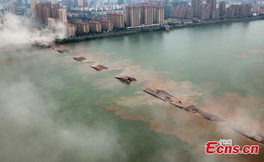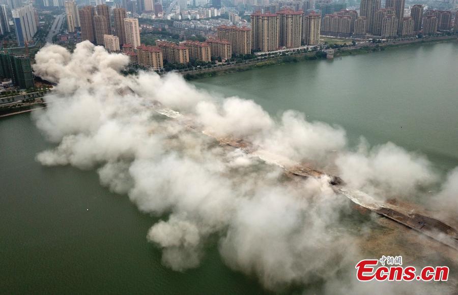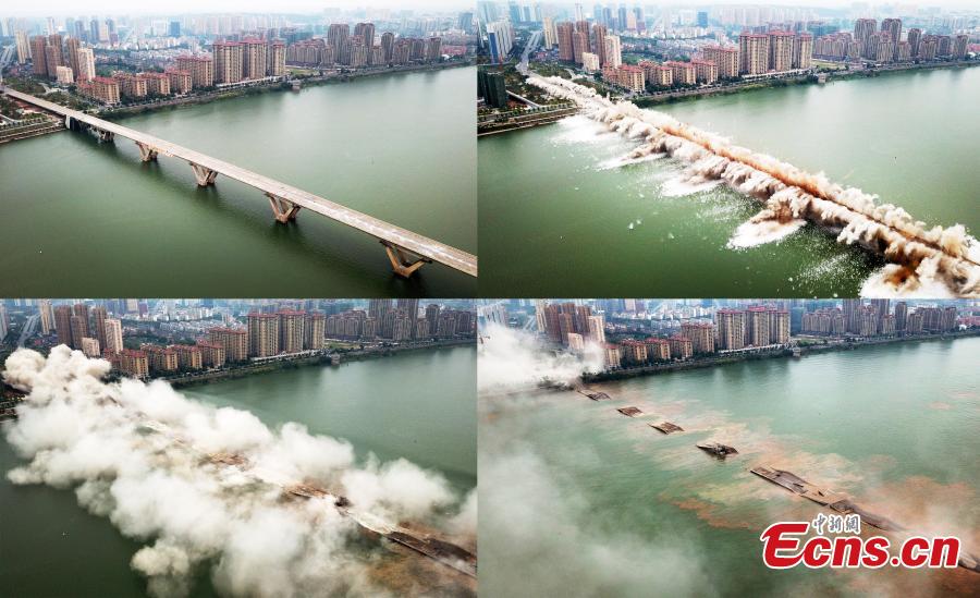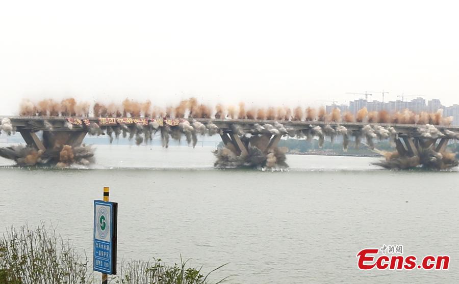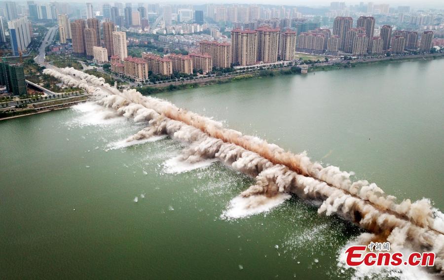 An old bridge is demolished in a controlled explosion in Ji’an City, East China’s Jiangxi Province, Sept. 28, 2018. The bridge, 1,577 meters long and 19.5 meters wide, fell into disrepair after heavy traffic amid rapid economic growth. (Photo: China News Service/Hong Yi)