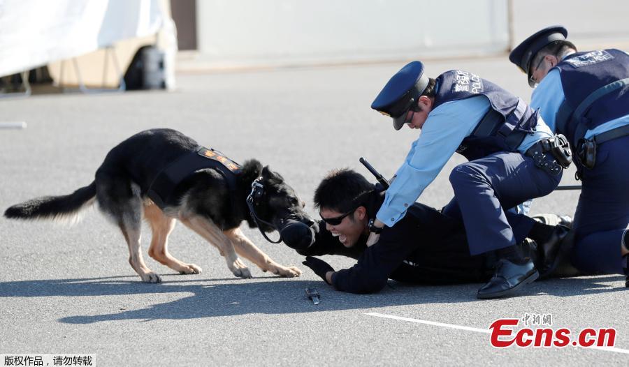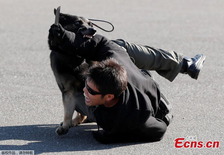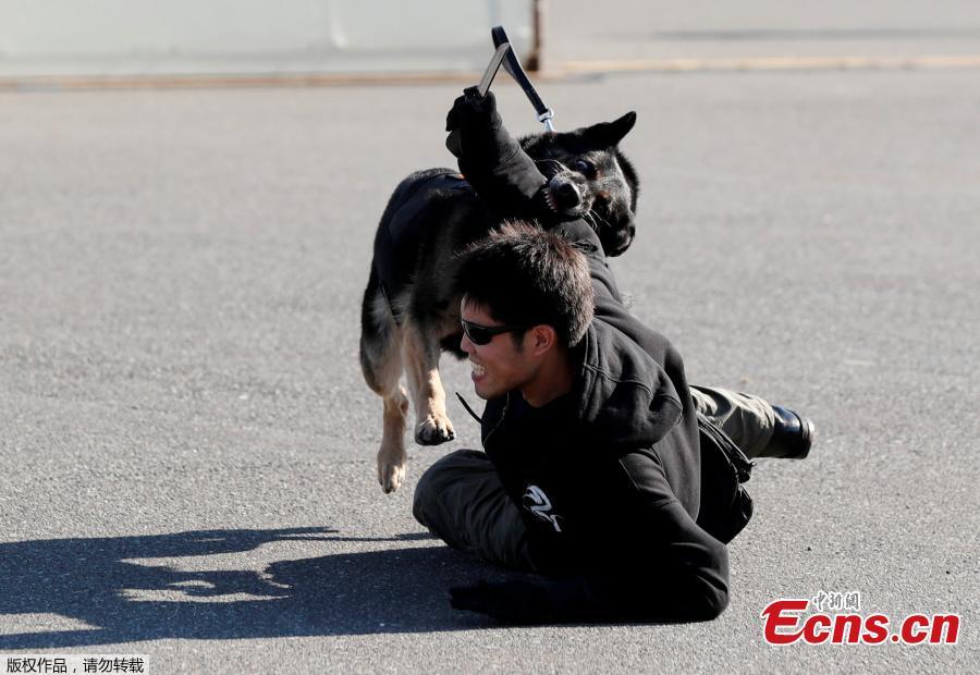 A police officer role playing a suspect is attacked by a police dog during Tokyo 2020 and Tokyo Metropolitan Police Department Security Tests and Joint Drills ahead of the 2020 Olympics in Tokyo, Japan, September 28, 2018. (Photo/Agencies)