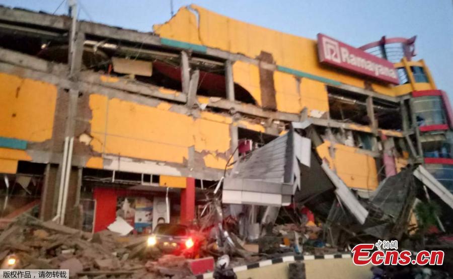 A handout photo made available by the Indonesian National Board for Disaster Management (BNPB) shows a collapsed shopping mall after a 7.7 magnitude earthquake that hit in Donggala, Central Sulawesi, Indonesia, Sept. 28, 2018. A tsunami caused deaths when it hit a small city on the Indonesian island of Sulawesi on Friday after a major quake, collapsing buildings and cutting off power, officials said, although the exact number of casualties was not clear.(Photo/Agencies)