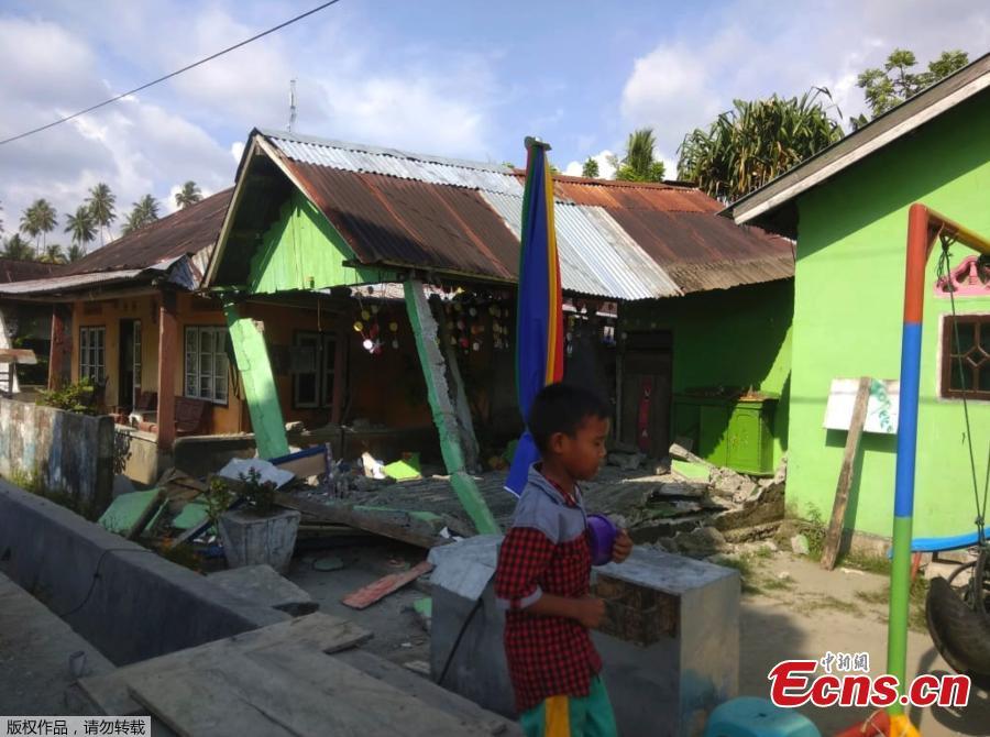A handout photo made available by the Indonesian National Board for Disaster Management (BNPB) shows a boy walking in front of a collapsed house after an earthquake in Donggala, Central Sulawesi, Indonesia, Sept. 28, 2018. A tsunami caused deaths when it hit a small city on the Indonesian island of Sulawesi on Friday after a major quake, collapsing buildings and cutting off power, officials said, although the exact number of casualties was not clear.(Photo/Agencies)