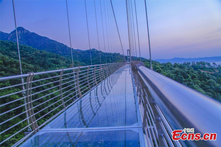A drone photo shows a 379-meter-long glass bridge built in the Nandan Mountain area in Foshan City, South China’s Guangdong Province, which opened on Sept. 28, 2018 after passing safety test. The glass bridge, suspended 202 meters above the ground, makes use of innovative technology to create impressive sound and visual effects. (Photo: China News Service/Zeng Linghua)