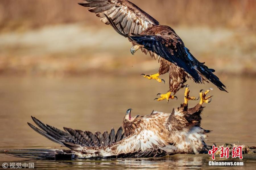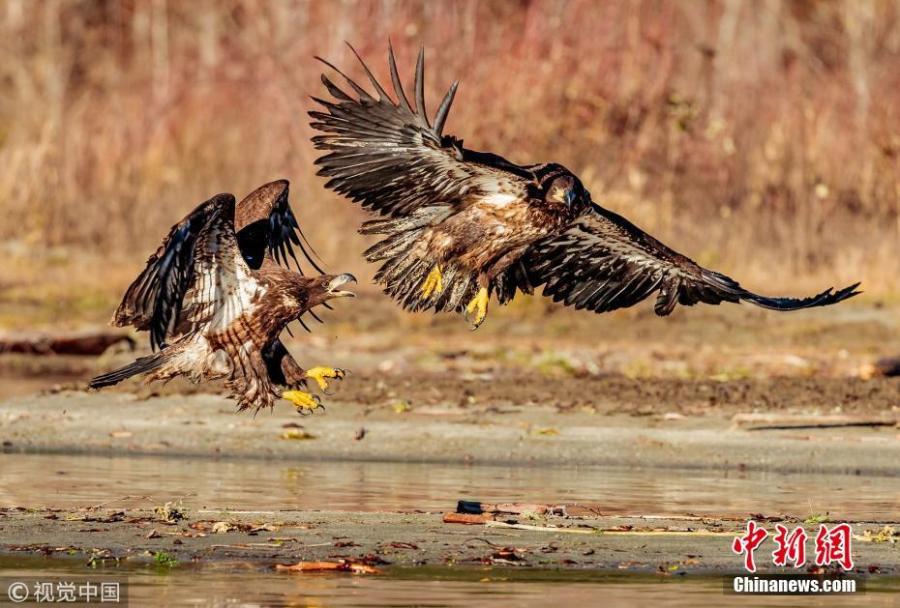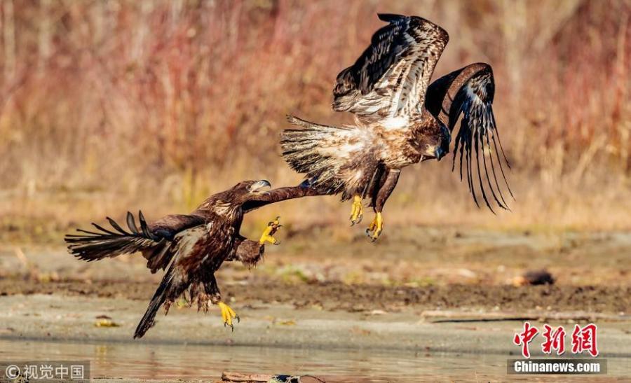 Photo taken by Loren Mooney, 57, shows juvenile Bald Eagles fighting over a salmon in a river in Skagit Valley, Washington. (Photo/VCG)