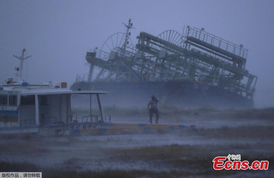 A ship (back) washes ashore at a port in Yonabaru, Okinawa Prefecture, on Sept. 29, 2018, as typhoon Trami approaches Japan's southernmost prefecture. (Photo/Agencies)