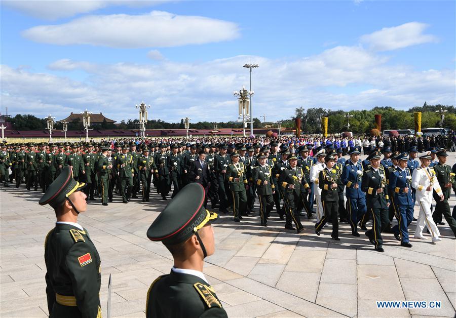 A ceremony to pay tribute and lay floral baskets to the Monument to the People's Heroes is held at Tian'anmen Square in Beijing, capital of China, Sept. 30, 2018, on the occasion of the Martyrs' Day. (Xinhua/Rao Aimin)