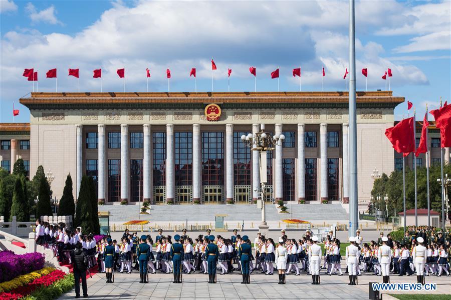 A ceremony to pay tribute and lay floral baskets to the Monument to the People's Heroes is held at Tiananmen Square in Beijing, capital of China, Sept. 30, 2018, on the occasion of the Martyrs' Day. (Xinhua/Zhai Jianlan)
