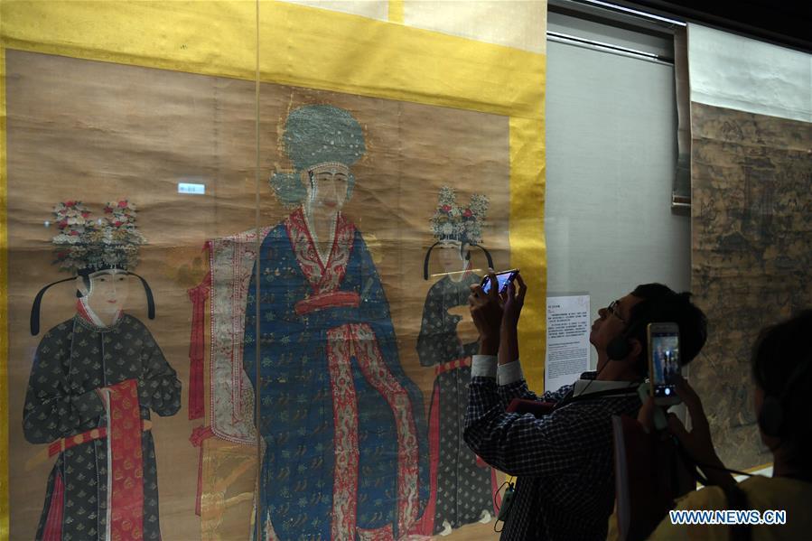 A journalist takes photos of "Seated Portrait of Song Renzong's Empress" at the palace museum in Taipei, southeast China's Taiwan, Oct. 3, 2018. The museum will hold an exhibition under the title of "Another look at National Treasures: Select Masterpieces of Painting and Calligraphy in the Museum Collection". The exhibition running from Oct. 4 to Dec. 25, 2018 will include 26 works of painting and calligraphy dating from the Eastern Jin Dynasty (317-420) to the Yuan Dynasty (1271-1368). (Xinhua/Jin Liangkuai)
