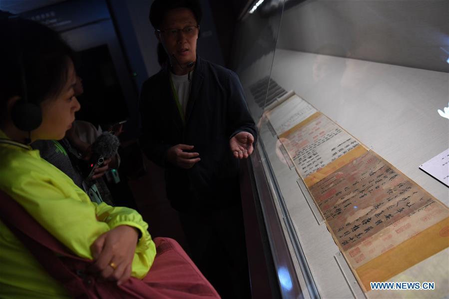 A staff worker introduces a calligraphy work of Wang Xizhi at the palace museum in Taipei, southeast China's Taiwan, Oct. 3, 2018. The museum will hold an exhibition under the title of "Another look at National Treasures: Select Masterpieces of Painting and Calligraphy in the Museum Collection". The exhibition running from Oct. 4 to Dec. 25, 2018 will include 26 works of painting and calligraphy dating from the Eastern Jin Dynasty (317-420) to the Yuan Dynasty (1271-1368). (Xinhua/Jin Liangkuai)