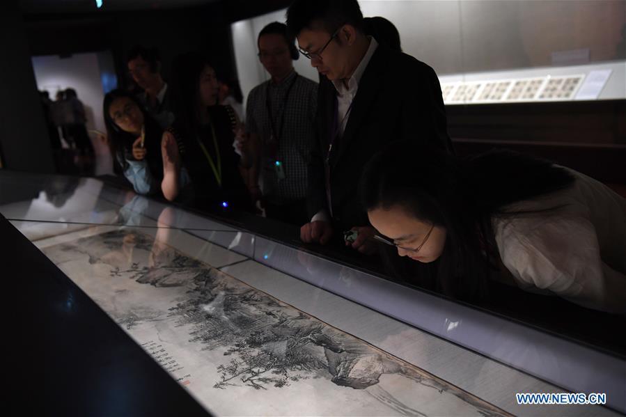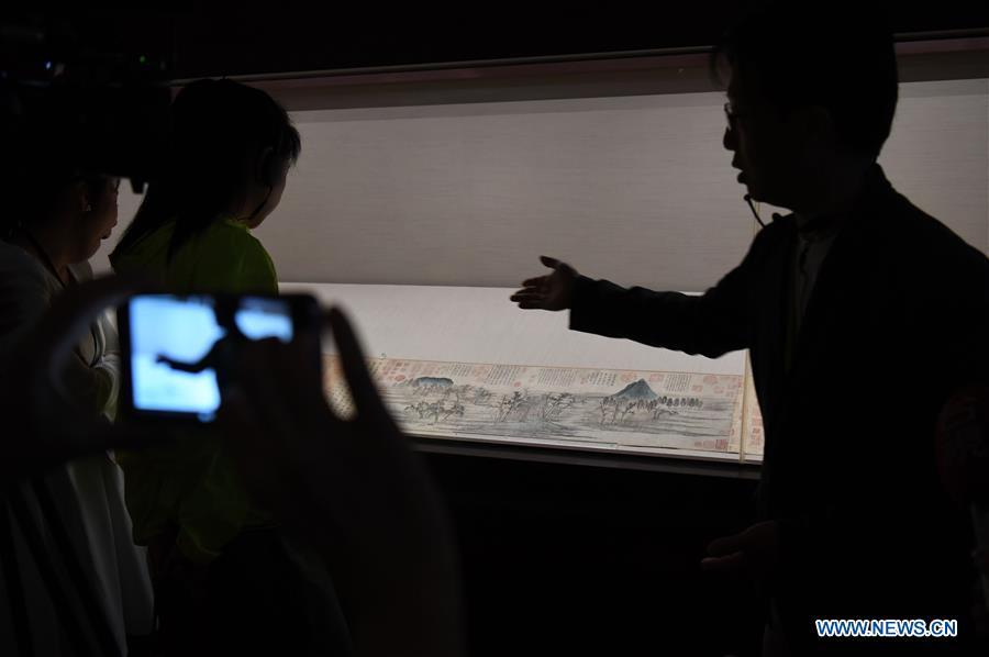 Journalists view a painting at the palace museum in Taipei, southeast China's Taiwan, Oct. 3, 2018. The museum will hold an exhibition under the title of "Another look at National Treasures: Select Masterpieces of Painting and Calligraphy in the Museum Collection". The exhibition running from Oct. 4 to Dec. 25, 2018 will include 26 works of painting and calligraphy dating from the Eastern Jin Dynasty (317-420) to the Yuan Dynasty (1271-1368). (Xinhua/Jin Liangkuai)