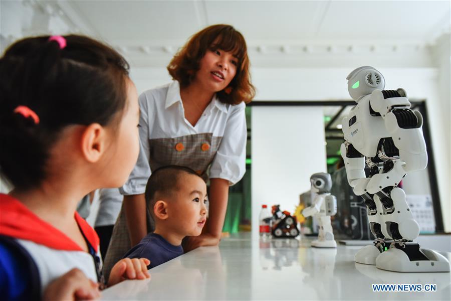 Children watch the robots displayed at the Beijing Design Week in Beijing, capital of China, Oct. 4, 2018. The Beijing Design Week, a platform aimed at promoting the concept of a sustainable development of creative and design industry, last from Sept. 22 to Oct. 7. (Xinhua/Li Mangmang)