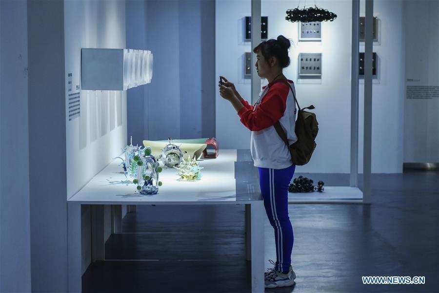 A visitor takes photos of art works displayed at the Beijing Design Week in Beijing, capital of China, Oct. 4, 2018. The Beijing Design Week, a platform aimed at promoting the concept of a sustainable development of creative and design industry, last from Sept. 22 to Oct. 7. (Xinhua/Li Mangmang)