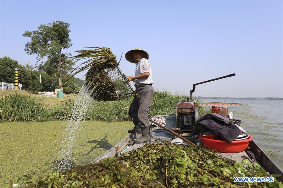 A worker dredges up water plants from Baima Lake in Huai'an City, east China's Jiangsu Province, Oct. 4, 2018. People from various sectors stick to their posts during the National Day holiday. (Xinhua/Wan Zhen)