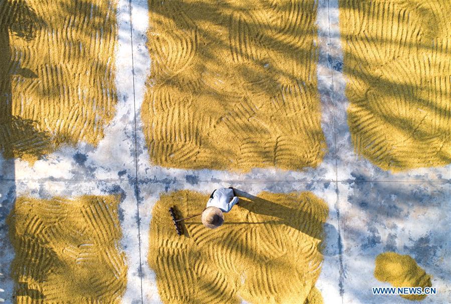 A villager rakes rice for air-drying in Luoyang Village of Duobao Township in Duchang County, east China's Jiangxi Province, Oct. 4, 2018. (Xinhua/Fu Jianbin)