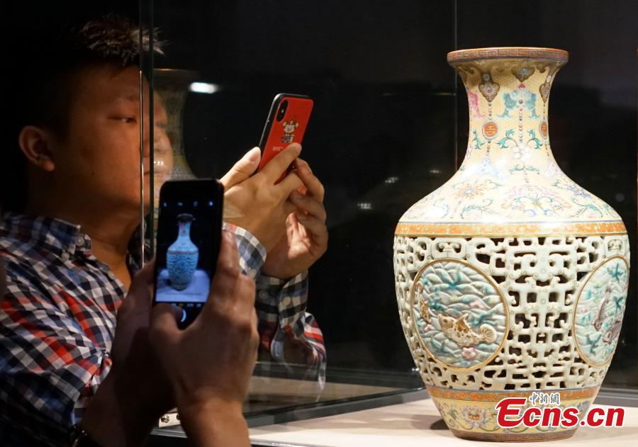 A vase made during the reign of Emperor Qianlong (1700s) fetched 149 million Hong Kong dollars (19 million U.S. dollars) at Sotheby's autumn auctions in Hong Kong. (Photo: China News/Zhang Wei)