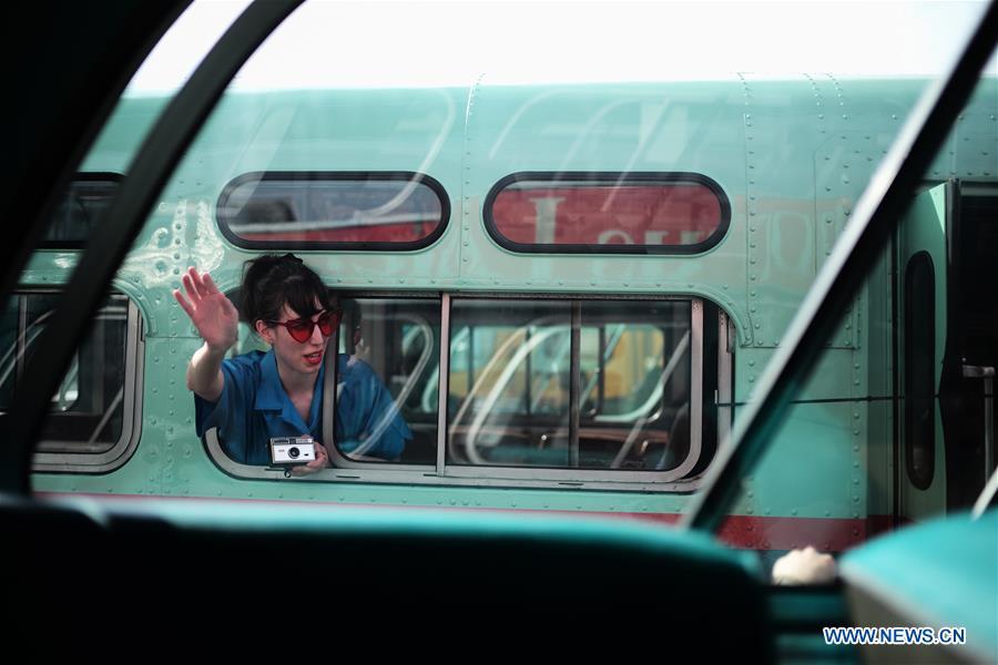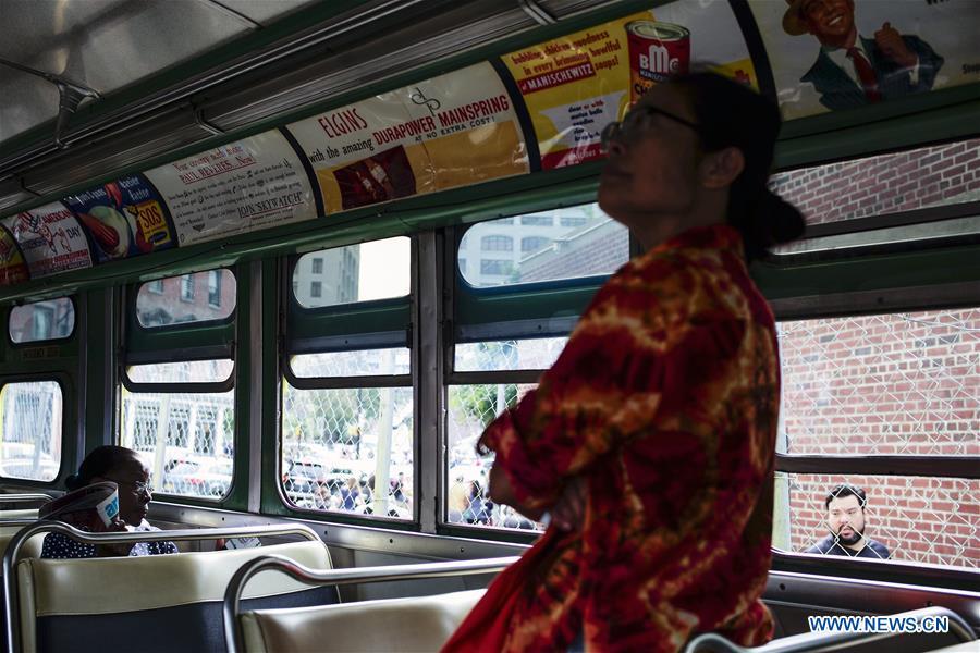 A woman views the interior of Bus 3100, one of the first air-conditioned buses to debut in the United States when it was tested in 1956, during the 25th Annual Bus Festival in New York, the United States, on Oct. 7, 2018. The New York Transit Museum held its 25th annual bus festival on Sunday. The buses on display represent about 80 years of surface transit history in New York City. The oldest bus at the festival, Bus 1263, is a double-decker bus that was purchased by the Fifth Avenue Bus Company in 1930. (Xinhua/Li Muzi)