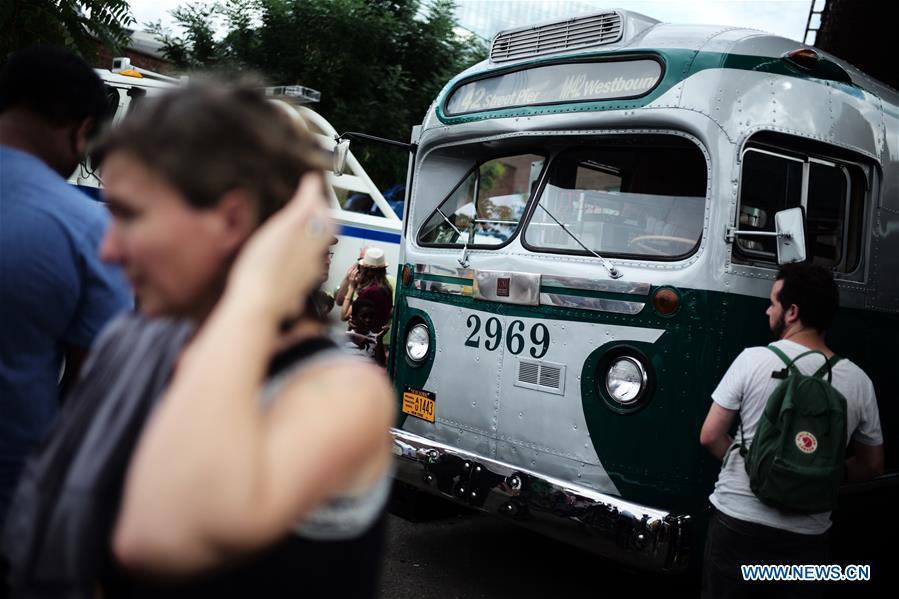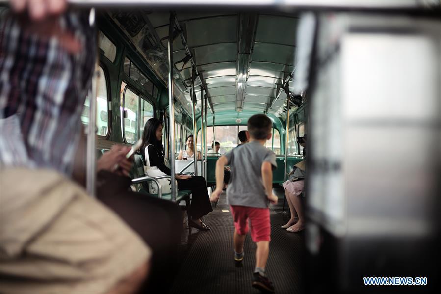 A vintage bus is seen during the 25th Annual Bus Festival in New York, the United States, on Oct. 7, 2018. The New York Transit Museum held its 25th annual bus festival on Sunday. The buses on display represent about 80 years of surface transit history in New York City. The oldest bus at the festival, Bus 1263, is a double-decker bus that was purchased by the Fifth Avenue Bus Company in 1930. (Xinhua/Li Muzi)