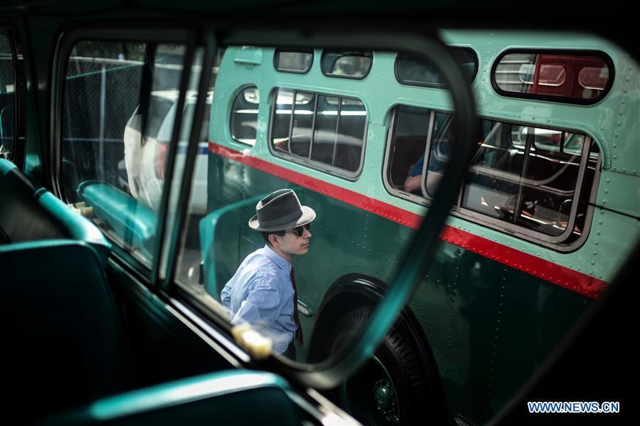 A man sits inside a vintage bus during the 25th Annual Bus Festival in New York, the United States, on Oct. 7, 2018. The New York Transit Museum held its 25th annual bus festival on Sunday. The buses on display represent about 80 years of surface transit history in New York City. The oldest bus at the festival, Bus 1263, is a double-decker bus that was purchased by the Fifth Avenue Bus Company in 1930. (Xinhua/Li Muzi)
