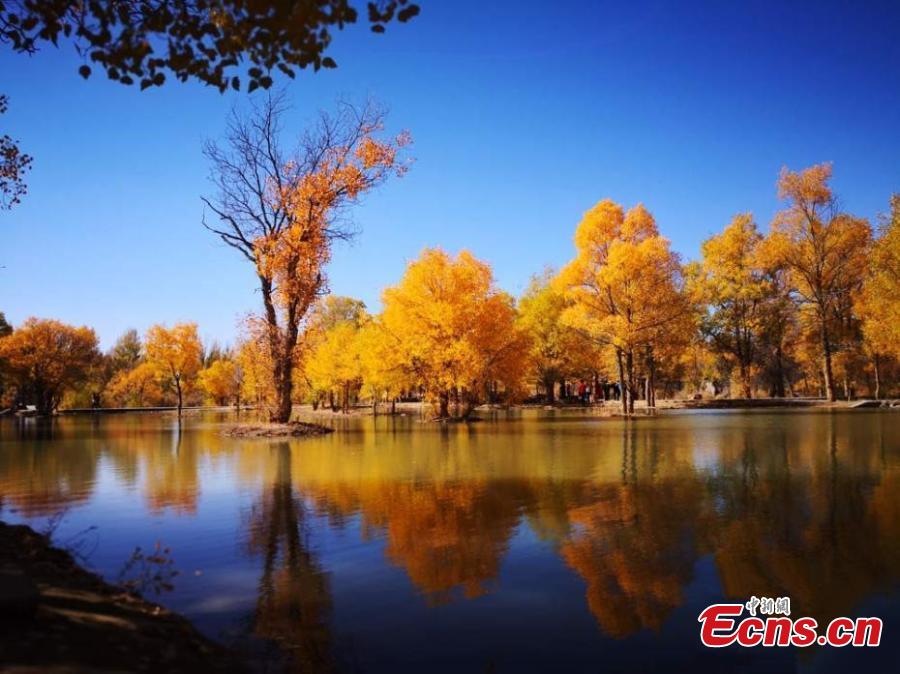Tourists visit a populus euphratica, or desert poplar, forest in Jinta County, Northwest China's Gansu Province, Oct. 5, 2018. Covering 5,300 hectares, the forest in the west of the county is an important part of Three-North Shelter Forest Program, a national ecological engineering effort. (Photo: China News Service/Gao Hongshan)