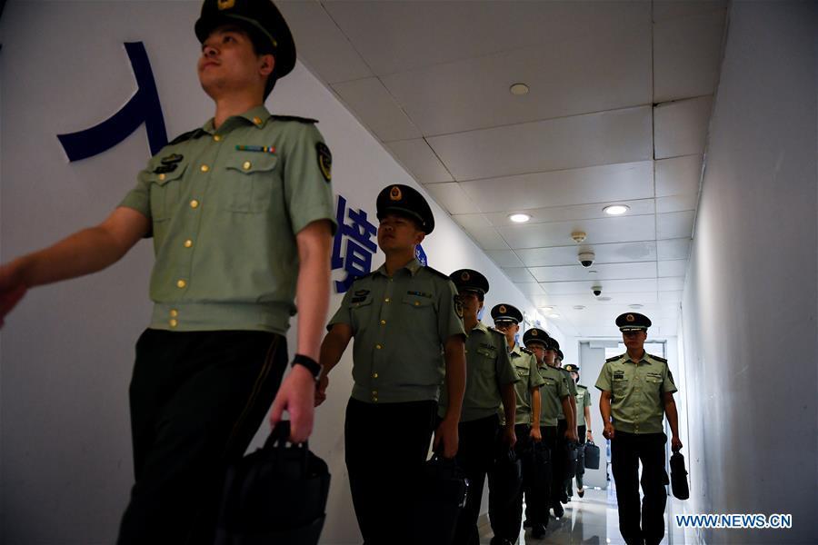 Wang Zhiguo (1st R) perpares to work at Nanjing Lukou International Airport in Nanjing, capital of east China's Jiangsu Province, Aug. 7, 2018. Wang Jicai, who used to be head of the militia post on Kaishan Island in Jiangsu Province, started working on the island in the Yellow Sea with his wife in 1986. He died of sudden illness while on duty in July of 2018 at the age of 58. Wang Zhiguo, son of Wang Jicai, became a frontier defence policeman after his graduation from Nanjing University of Aeronautics and Astronautics in 2013. He had been assigned to many security tasks for major events during 5 years' working. (Xinhua/Li Xiang)