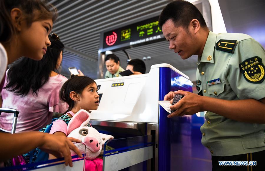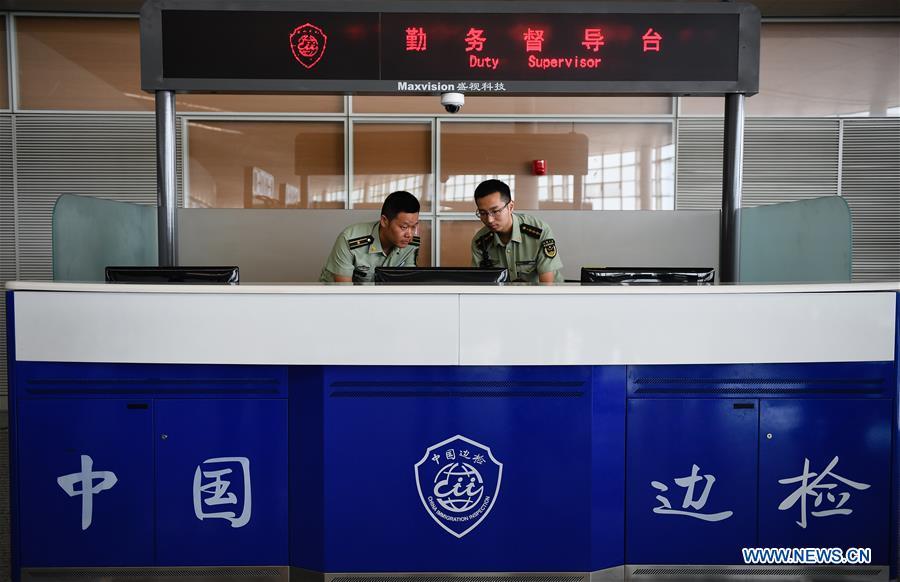 Wang Zhiguo (R) checks passengers' identity certificates at Nanjing Lukou International Airport in Nanjing, capital of east China's Jiangsu Province, Aug. 7, 2018. Wang Jicai, who used to be head of the militia post on Kaishan Island in Jiangsu Province, started working on the island in the Yellow Sea with his wife in 1986. He died of sudden illness while on duty in July of 2018 at the age of 58. Wang Zhiguo, son of Wang Jicai, became a frontier defence policeman after his graduation from Nanjing University of Aeronautics and Astronautics in 2013. He had been assigned to many security tasks for major events during 5 years' working. (Xinhua/Li Xiang)