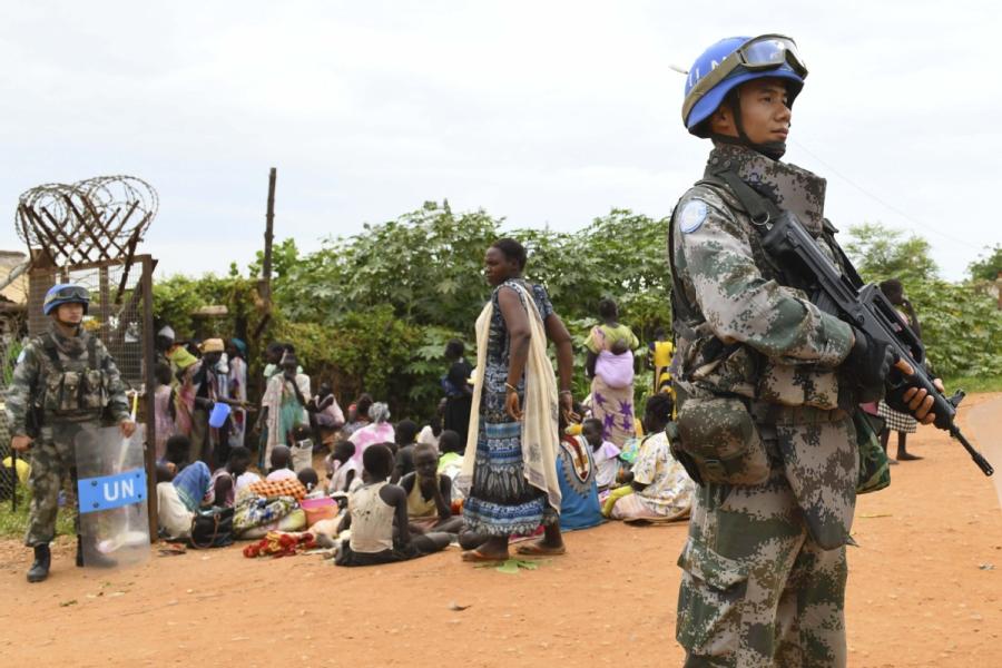 Chinese peacekeepers protect local people in a camp where weapons were confiscated in Juba in May. (Provided to China Daily)