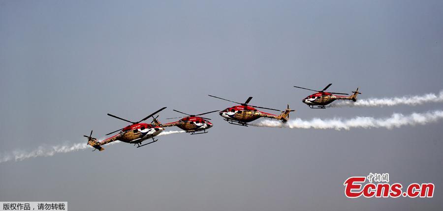 Advanced Light Helicopters (ALH) from the Indian Air Force's Sarang aerobatics team perform during the Air Force Day parade at the Air Force station Hindon in Ghaziabad town on the outskirts of New Delhi on October 8, 2018. The Indian Air Force celebrated its 86th anniversary on October 8, 2018. (Photo/Agencies)