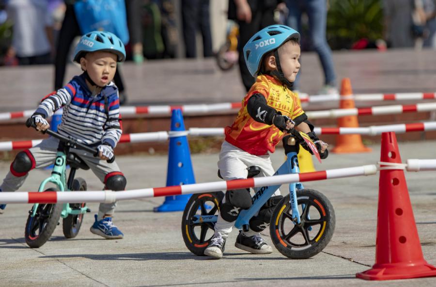 Children take part in a balance bike race in Xinyu city, East China's Jiangxi Province, on Oct. 5, 2018. (Photo/Xinhua)