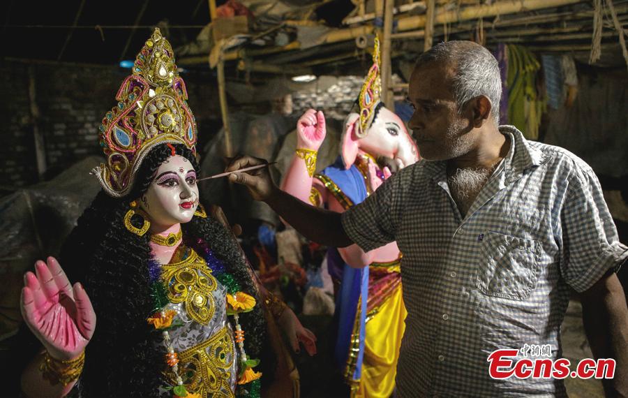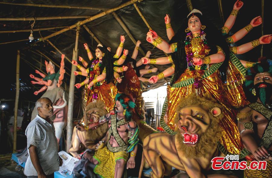 An Indian artist looks at statues during a workshop ahead of the Dashain festival in Kathmandu, Nepal, Oct. 8, 2018. Dashain is one of the most important festivals in Nepal. (Photo: China News Service/Pradhan)