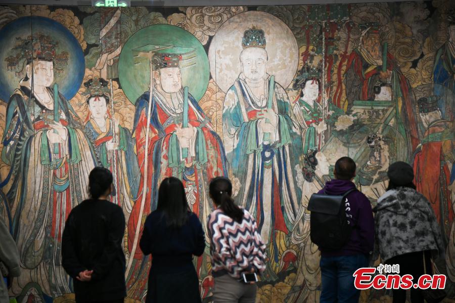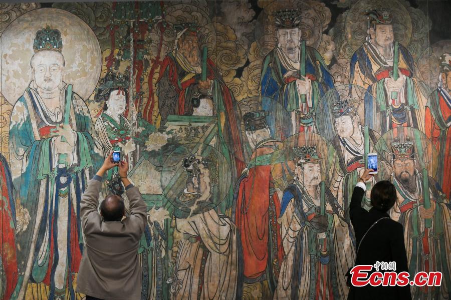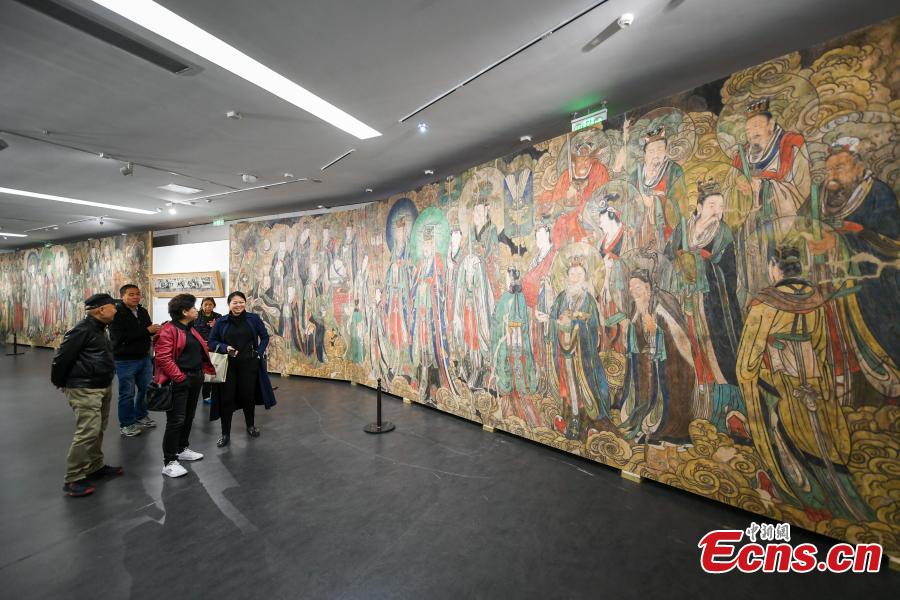 Visitors look at a replica of Chao Yuan Tu (Pictures of Paying Homage to the Origin), the famous wall murals that depict the story of Taoism in Yongle Temple, at the Taiyuan Art Museum in Taiyuan City, North China’s Shanxi Province, Oct. 11, 2018. The life-size replica was created using high-tech means. The museum is exhibiting 80 replicas of ancient original murals from China but now collected in other countries. (Photo: China News Service/Wu Junjie)