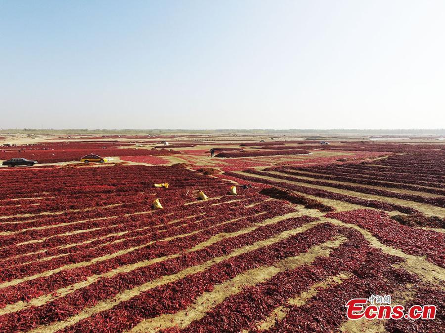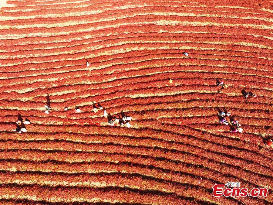 Farmers reap chilies in a fiery red field in the Yanqi area of the Xinjiang Production and Construction Corps (XPCC), a quasi-military, governmental organization in the Xinjiang Uygur autonomous region. Yanqi, with its fertile soils and long sunshine hours, is a major production base for chilies. A main source of income for the region, the high-quality chilies sell well in provinces including Shandong, Shaanxi, Hebei and Shanxi. (Photo: China News Service/He Fei)
