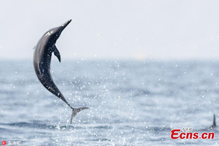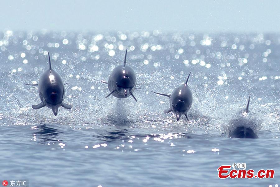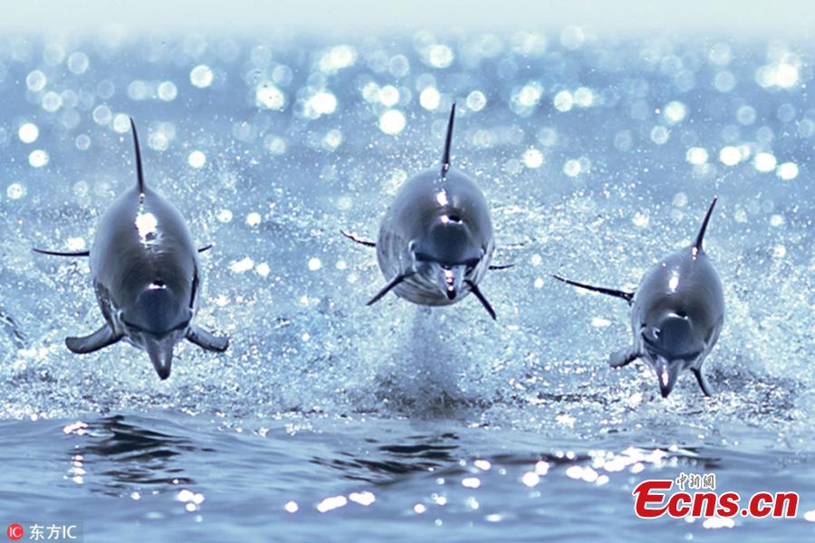 Photo taken by Mithun C Mohan, 36, shows the moment three dolphins leaping out of the water in open sea near the Muscat Coast in Oman. (Photo/IC)