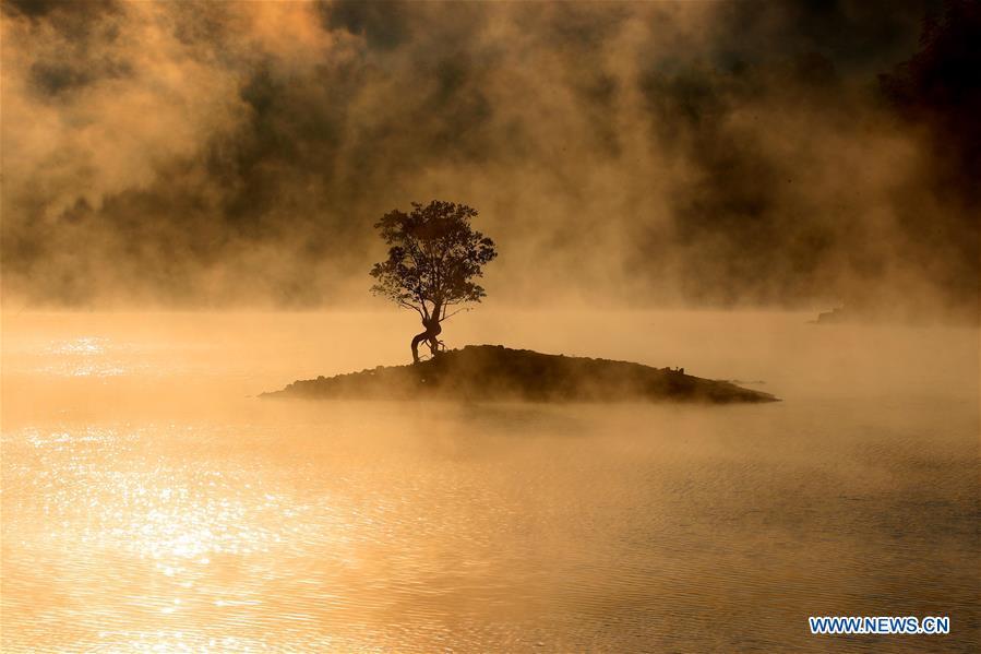 Photo taken on Oct. 11, 2018 shows an autumn scenery of the fog-enveloped Qishu Lake in Huangshan, east China's Anhui Province. (Xinhua/Shi Guangde)