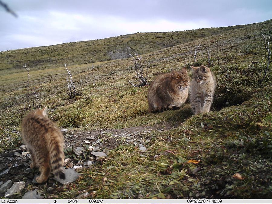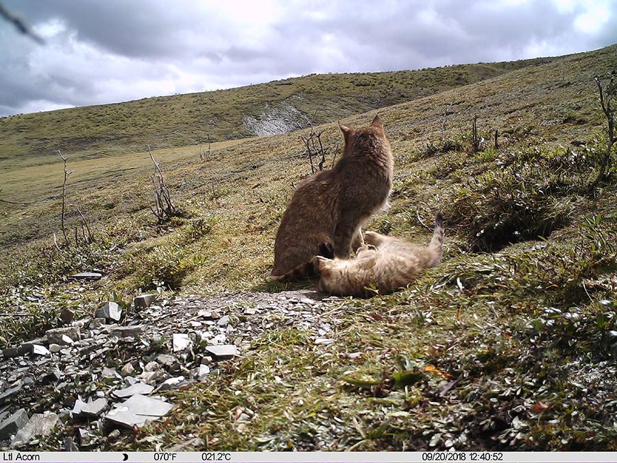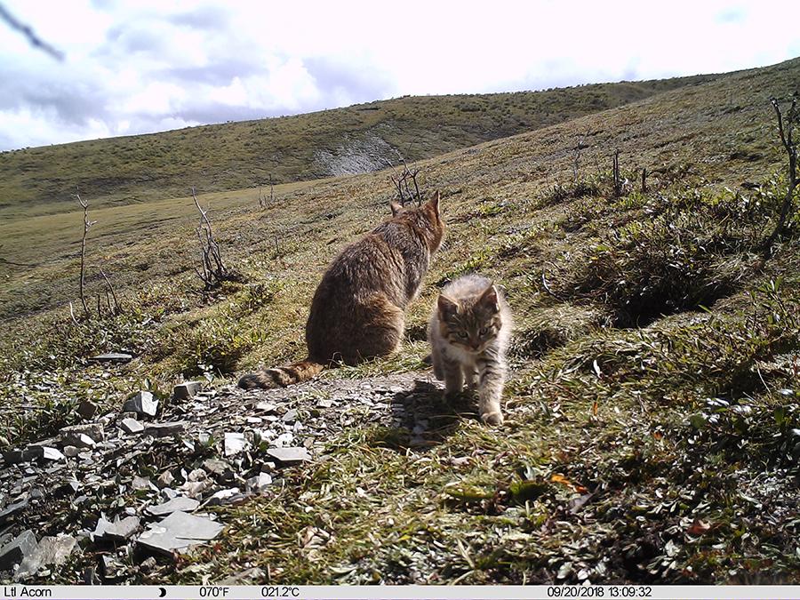 Photo taken by an infrared camera shows a Chinese mountain cat with its kitten in Sanjiangyuan area,Northwest China's Qinghai Province, Sept. 19, 2018. The Chinese mountain cat is a wild felid endemic to China that is under second-class national protection. (Photo/Xinhua)