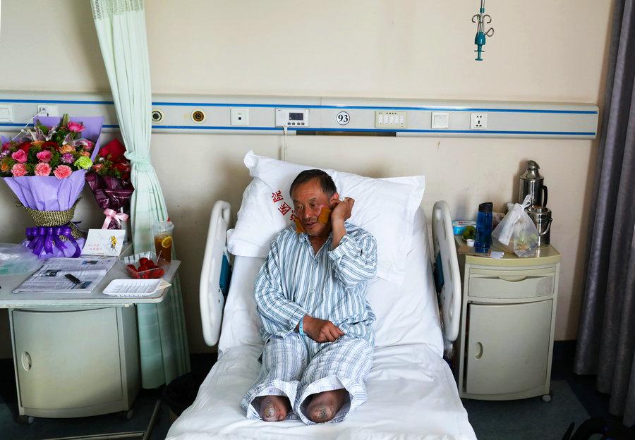 Xia receives treatment in a hospital for his frostbitten face and fingers. (Photo/China Daily)