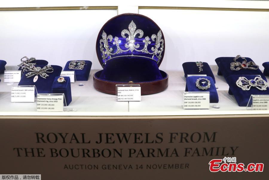 A Hubner diamond tiara, circa 1912, estimated at $350,000 - $550,000, is displayed at Sotheby's, in New York, Oct. 12, 2018. It is part of the "Royal Jewels from the Bourbon-Parma Family," sale to be held Nov. 14, 2018 in Geneva. The French queen's jewels on view include a 49-karat natural pearl and diamond pendant, as well as necklaces, brooches, and earrings valued in total at between $1.5 and 3 million. (Photo/Agencies)