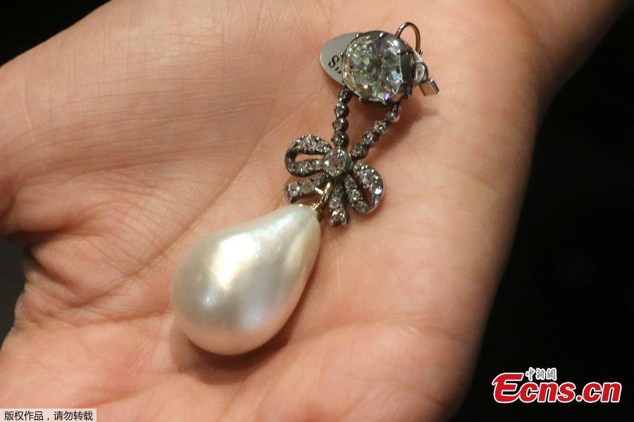 The Queen Marie Antoinette Pearl and diamond pendant, from the 18th century, estimated at $1 million - $2 million, is displayed at Sotheby's, in New York, Oct. 12, 2018. It is part of the "Royal Jewels from the Bourbon-Parma Family," sale to be held Nov. 14, 2018 in Geneva. The French queen's jewels on view include a 49-karat natural pearl and diamond pendant, as well as necklaces, brooches, and earrings valued in total at between $1.5 and 3 million. (Photo/Agencies)