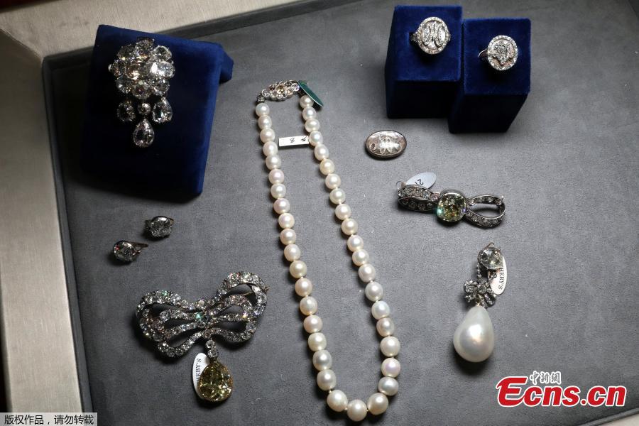 Items that belonged to Marie Antoinette, that will be included in the "Royal Jewels from the Bourbon-Parma Family" sale, are displayed at Sotheby's, in New York, Oct. 12, 2018. The sale is to be held Nov. 14, 2018 in Geneva. The French queen's jewels on view include a 49-karat natural pearl and diamond pendant, as well as necklaces, brooches, and earrings valued in total at between $1.5 and 3 million. (Photo/Agencies)