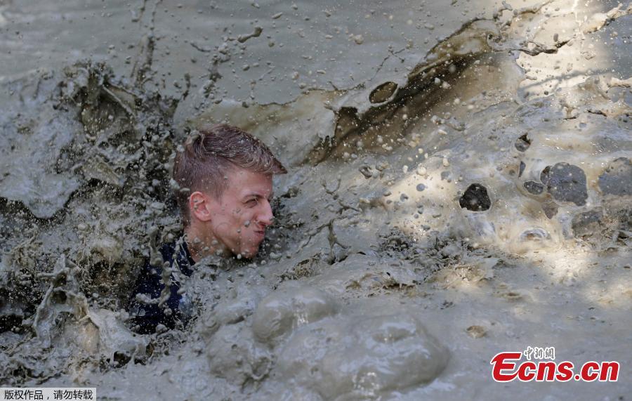 A competitor crosses a water obstacle during the 'Wild Boar Dirt Run' (Wildsau Dirt Run) near Brand-Laaben, Austria, October 13, 2018. People took part in a hard obstacle course in three distances 5, 10 and 20 kilometers. (Photo/Agencies)