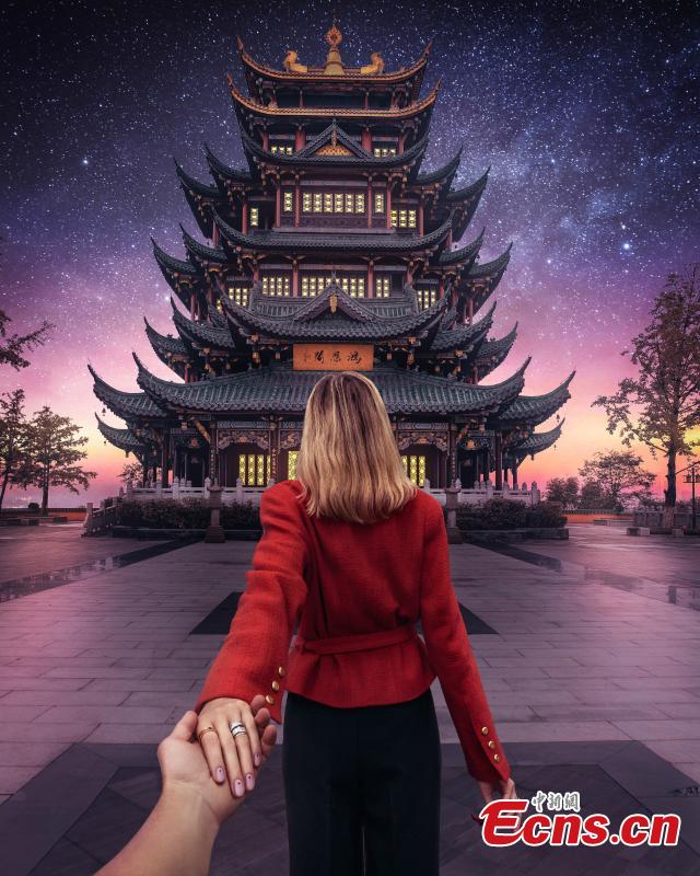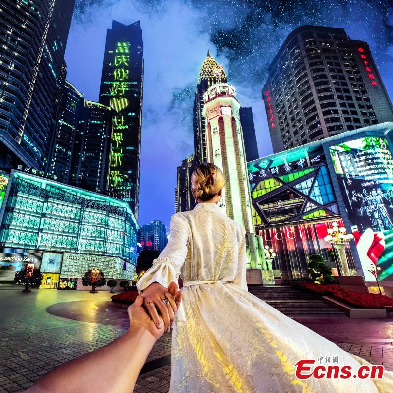 Russian artist Murad Osmann, best known for his ongoing “Follow Me To” series of works featuring his wife Nataly Osmann leading him around the world, has travelled to Southwest China’s Chongqing Municipality, presenting sweet photos with the city’s known landmarks including Hongya Cave, Hong’en Temple and International Finance Square. (Photo provided to China News Service)