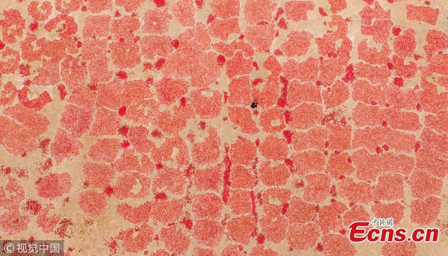 Stretches of chilies air-dry along a road in Kuqa County, Northwest China’s Xinjiang Uygur Autonomous Region, in this shot captured by drone. It is the chili harvest season in the region. (Photo/VCG)