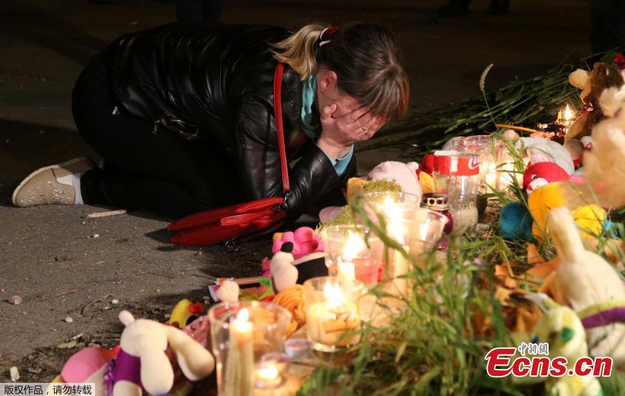 A mourner reacts at a makeshift memorial near the scene of a fatal attack on a college in the port city of Kerch, Crimea, Oct. 17, 2018. At least 19 people have been killed and dozens injured in a mass shooting at the college. (Photo/Agencies)