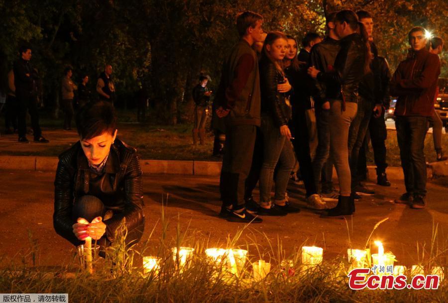 A woman lights a candle at a makeshift memorial near the scene of a fatal attack on a college in the port city of Kerch, Crimea, Oct. 17, 2018. At least 19 people have been killed and dozens injured in a mass shooting at the college. (Photo/Agencies)