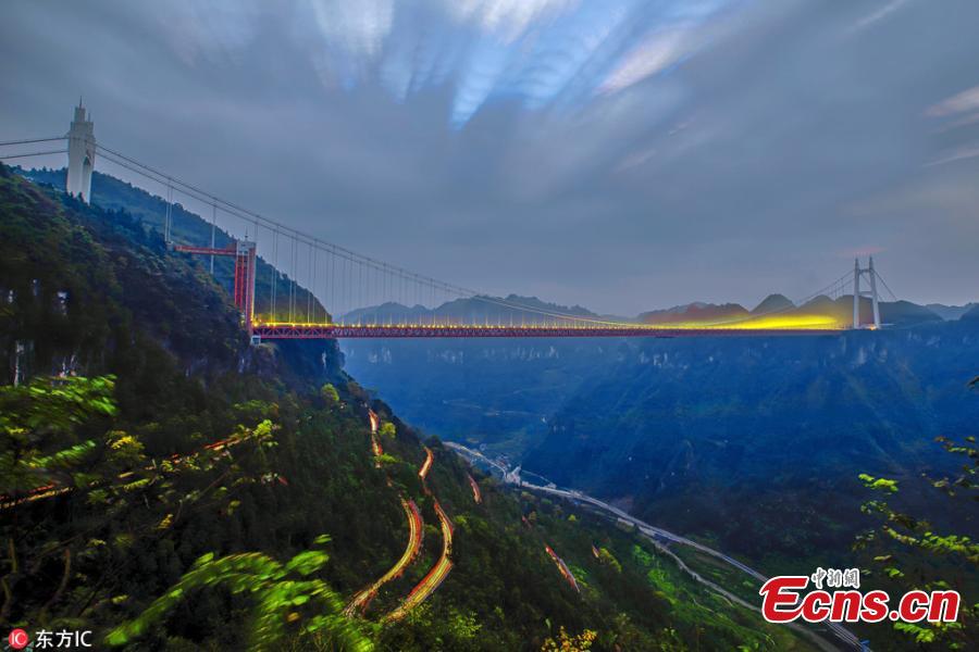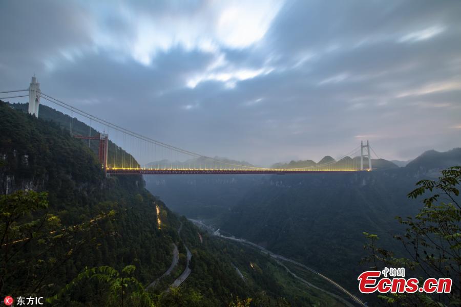 An early morning view of a winding road on a mountain and the Aizhai Bridge in Jishou City, Central China’s Hunan Province, Oct. 17, 2018. The suspension bridge was built as part of an expressway from southwest China's Chongqing Municipality to Changsha. The bridge links two tunnels 1,176 meters apart and carries traffic 330 meters above the floor of the Dehang Canyon, setting several records including the world's highest and longest tunnel-to-tunnel bridge. (Photo/IC)