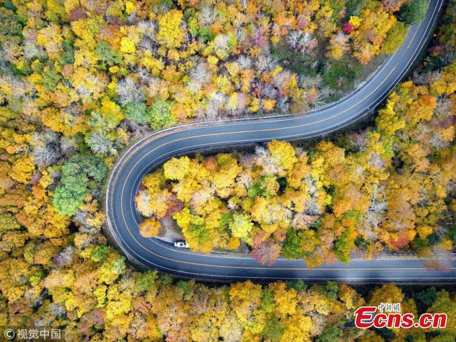 A drone photo shows the mountain road and fall foliage in Vermont, the United States. (Photo/VCG)