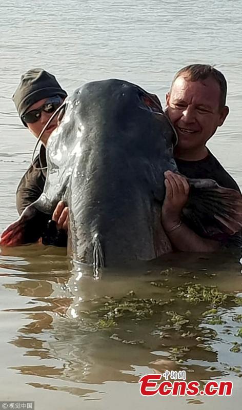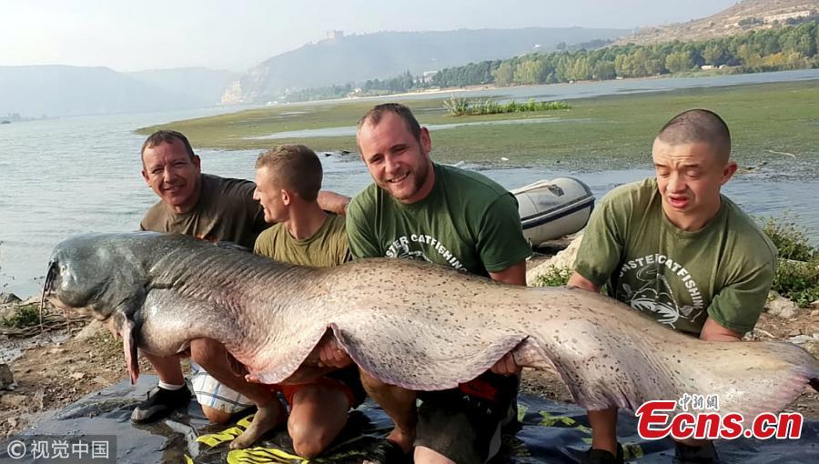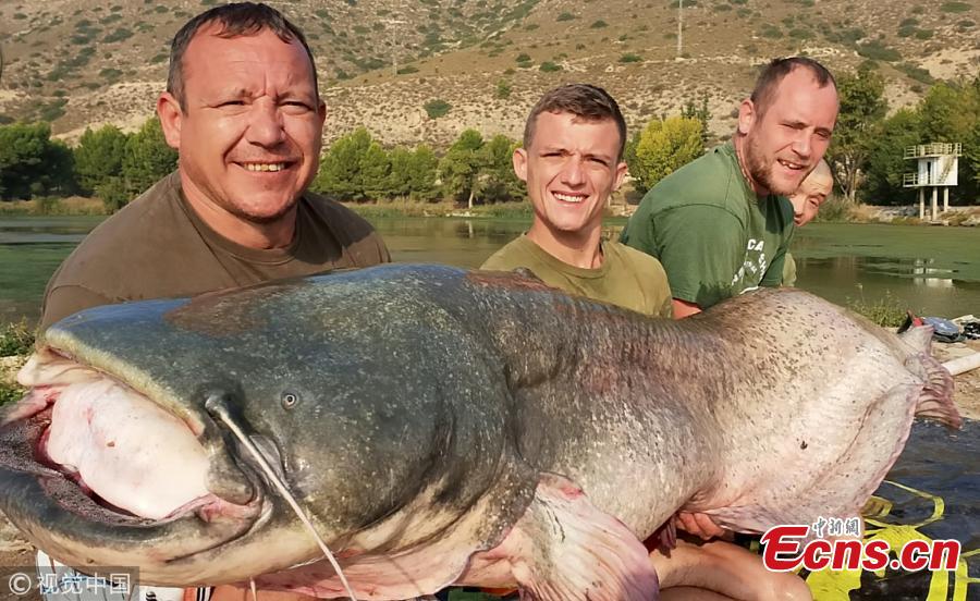Fishermen show a 110kg catfish caught by Peter Irwin in the Segre River, Mequinenza, Spain, Oct. 12, 2018. It took Irwin, 37, nearly an hour to haul the 2.4m-long fish out of the water. (Photo/VCG)