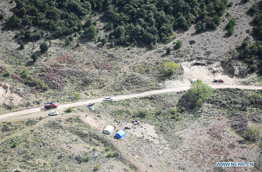 Aerial photo taken on Oct. 18, 2018 shows the dried-out lower reaches of the Yarlung Tsangpo River in Menling County, southwest China's Tibet Autonomous Region. More than 6,000 people have been evacuated after a barrier lake formed following a landslide in the Yarlung Tsangpo River in southwest China's Tibet Autonomous Region, local authorities said Thursday. According to the local disaster relief headquarters, the landslide struck during the early hours of Wednesday near a village in Menling County, blocking the river's waterway. The amounts of water in the lake has surpassed 300 million cubic meters. No casualties have been reported. Authorities in Tibet have launched an emergency response, monitoring the lake's water level, evacuating local residents and sending relief supplies to the disaster-hit areas. (Xinhua/Purbu Zhaxi)