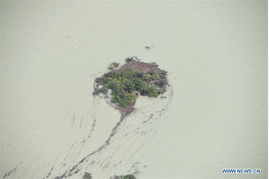 Aerial photo taken on Oct. 18, 2018 shows the barrier lake on the Yarlung Tsangpo River in Menling County, southwest China's Tibet Autonomous Region. More than 6,000 people have been evacuated after a barrier lake formed following a landslide in the Yarlung Tsangpo River in southwest China's Tibet Autonomous Region, local authorities said Thursday. According to the local disaster relief headquarters, the landslide struck during the early hours of Wednesday near a village in Menling County, blocking the river's waterway. The amounts of water in the lake has surpassed 300 million cubic meters. No casualties have been reported. Authorities in Tibet have launched an emergency response, monitoring the lake's water level, evacuating local residents and sending relief supplies to the disaster-hit areas. (Xinhua/Purbu Zhaxi)
