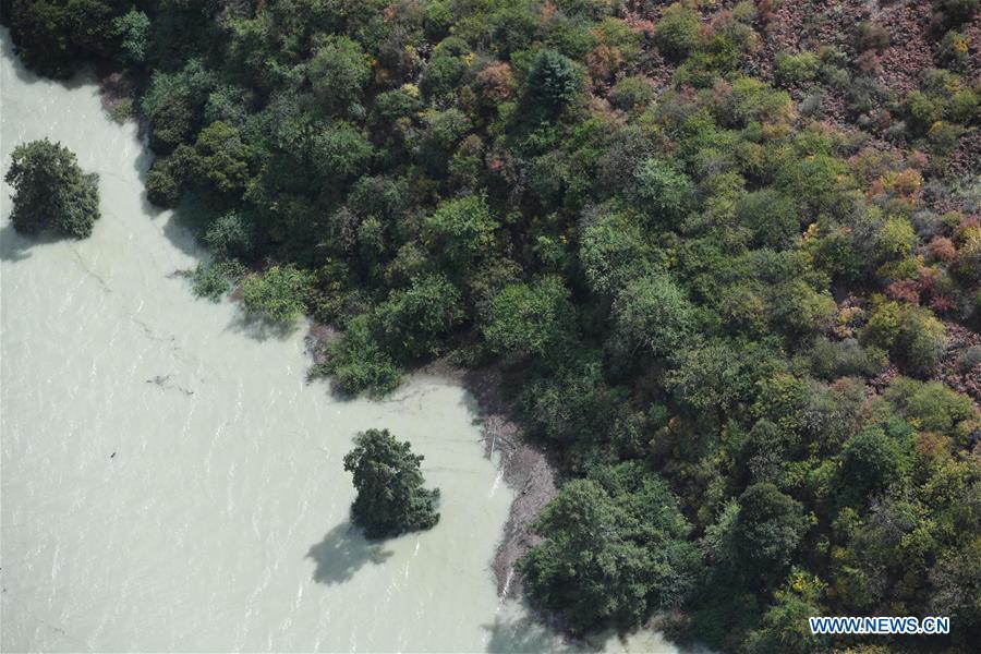 Aerial photo taken on Oct. 18, 2018 shows the Jiala Village threatened by the landslide-caused barrier lake on the Yarlung Tsangpo River in Menling County, southwest China's Tibet Autonomous Region. More than 6,000 people have been evacuated after a barrier lake formed following a landslide in the Yarlung Tsangpo River in southwest China's Tibet Autonomous Region, local authorities said Thursday. According to the local disaster relief headquarters, the landslide struck during the early hours of Wednesday near a village in Menling County, blocking the river's waterway. The amounts of water in the lake has surpassed 300 million cubic meters. No casualties have been reported. Authorities in Tibet have launched an emergency response, monitoring the lake's water level, evacuating local residents and sending relief supplies to the disaster-hit areas. (Xinhua/Purbu Zhaxi)