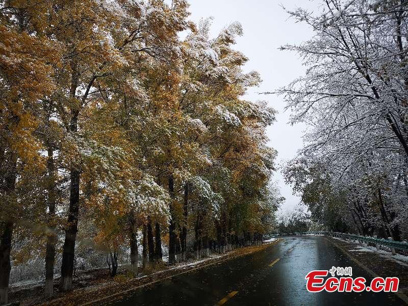 Colorful autumn leaves provide a color contrast to early-season snow as a a cold front hits the Tianshan Tianchi scenic area in Northwest China’s Xinjiang Uygur Autonomous Region, as seen in these photos taken on Oct. 17 and 18. (Photo provided to China News Service)