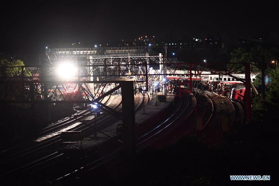 Photo taken on Oct. 21, 2018 shows the rescuing site of the train derailment accident in Yilan County, southeast China's Taiwan. At least 18 people died and another 120 injured, after a passenger train derailed in Taiwan on Sunday afternoon, according to the island's railway authority. The Puyuma Express No. 6432 bound for Taitung from Shulin Station with 366 passengers on board derailed at 4:50 p.m. local time at Su'aoxin Station in Yilan County. A total of 17 people were declared dead before being sent to hospital. Five of the eight cars of the express train overturned. The cause of the derailment is still under investigation. (Xinhua/Jin Liangkuai)
